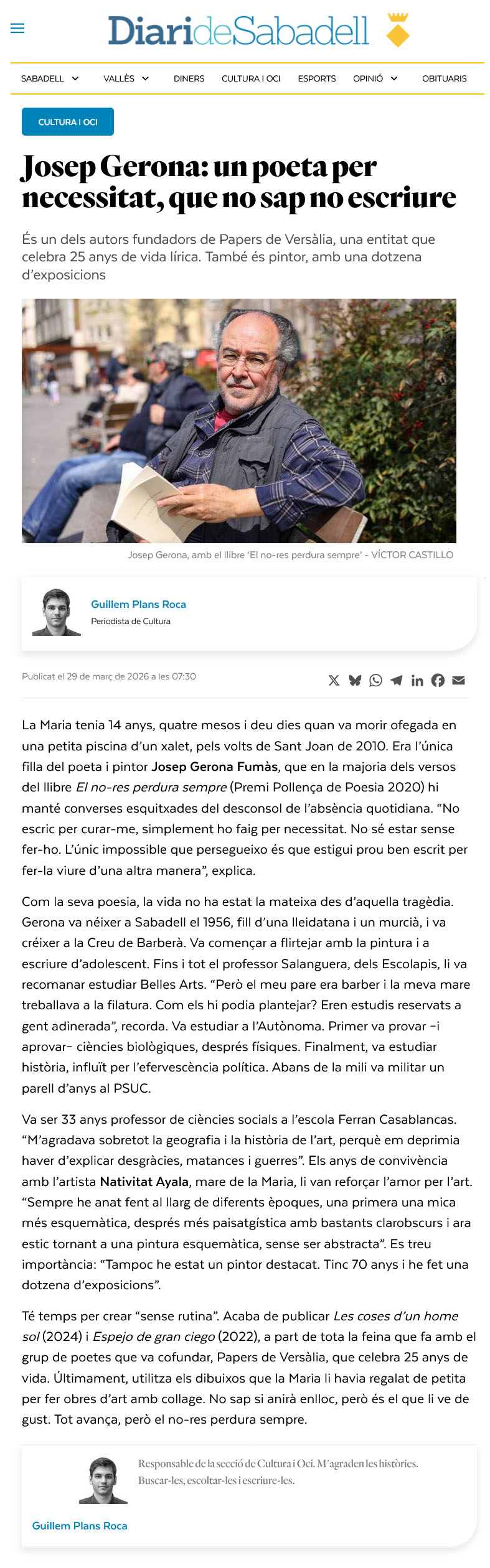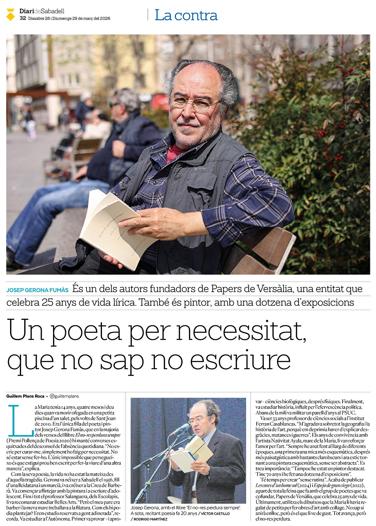 Entrevista a Josep Gerona Fumàs aparecida en La contra del Diari de Sabadell, sobre su obra, como pintor y poeta, y su trayectoria de vida.