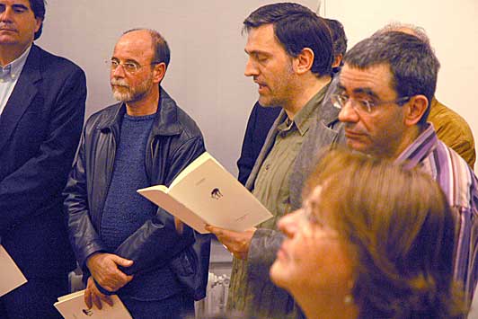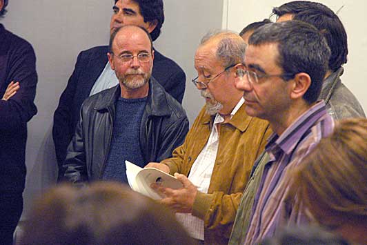 Els poetes Marcel Ayats, Esteban Martínez i Josep Maria Ripoll en un moment de la lectura de poemes.