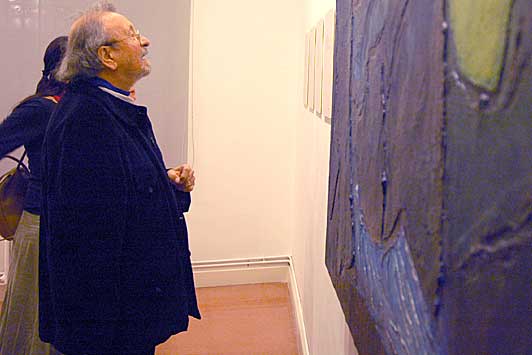El pintor Xavier Oriach llegeix els poemes que han estat inspirats en la seva obra, la qual podem veure a la dreta de la fotografia.